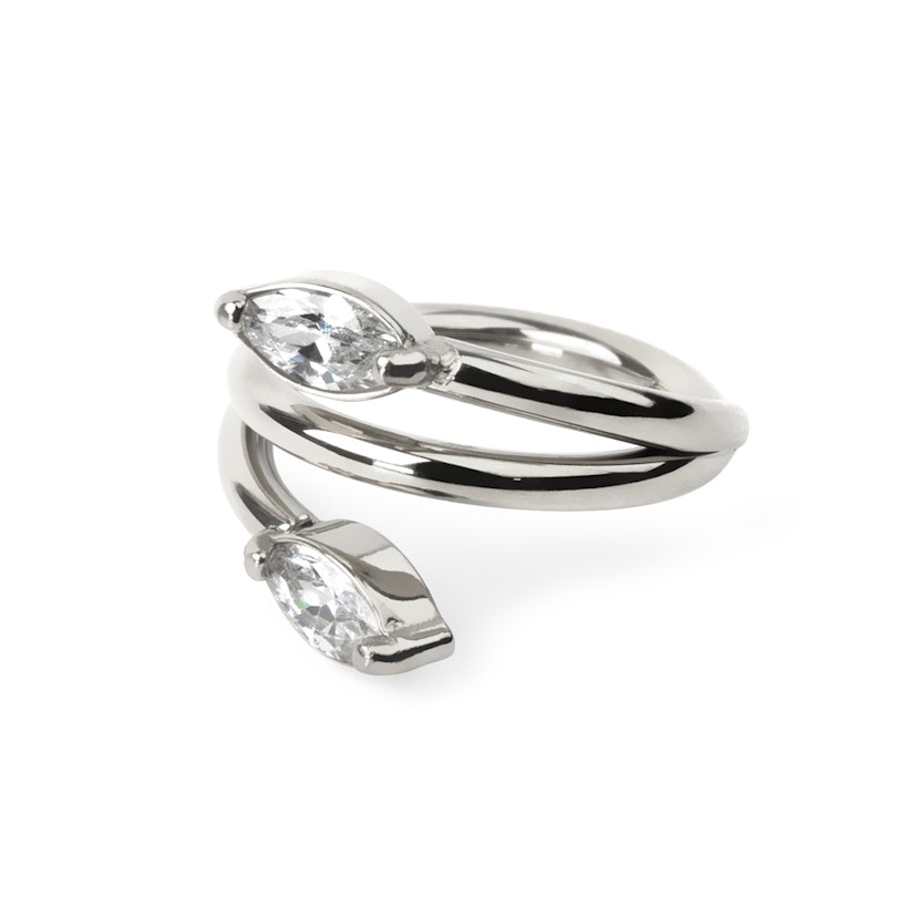 Delicato cerchio con cerniera in acciaio chirurgico. Questo bellissimo anello presenta due pietre a taglio marquise incastonate che danno l'aspetto di due foglie su una vite. Disponibile con un diametro di 8 mm o 10 mm e a scelta tra la versione color oro giallo o grigio brillante, questo versatile gioiello starà benissimo in ogni tipo di piercing, in particolare nei piercing alla cartilagine come il rook e l'helix.
