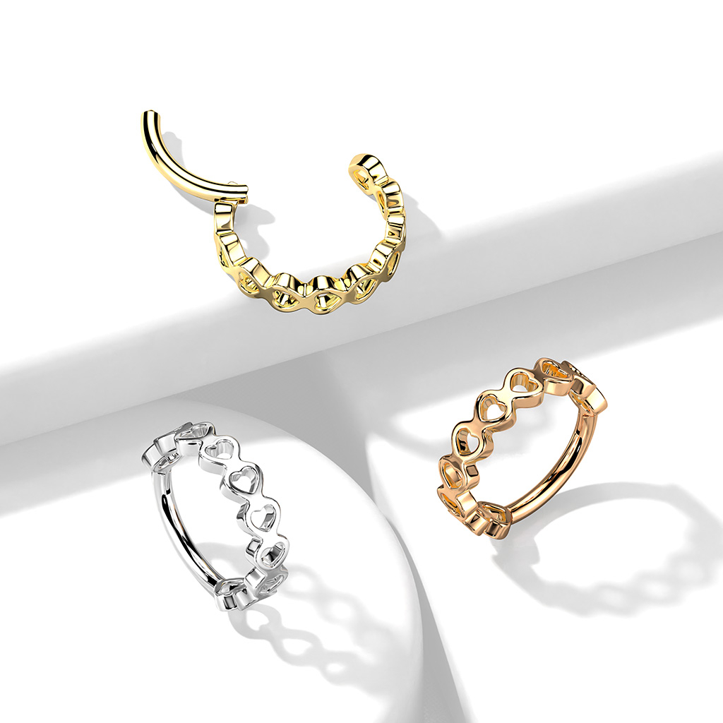 Con tutti i suoi cuori, questo cerchio dà un tocco speciale ai tuoi piercing. Il gioiello è realizzato in acciaio chirurgico e si apre e chiude usando il meccanismo di chiusura con cerniera, che lo rende un gioiello facilmente intercambiabile. Ha un diametro del filo di 1,2 mm e puoi sceglierlo tra 2 lunghezze, 8 mm e 10 mm.