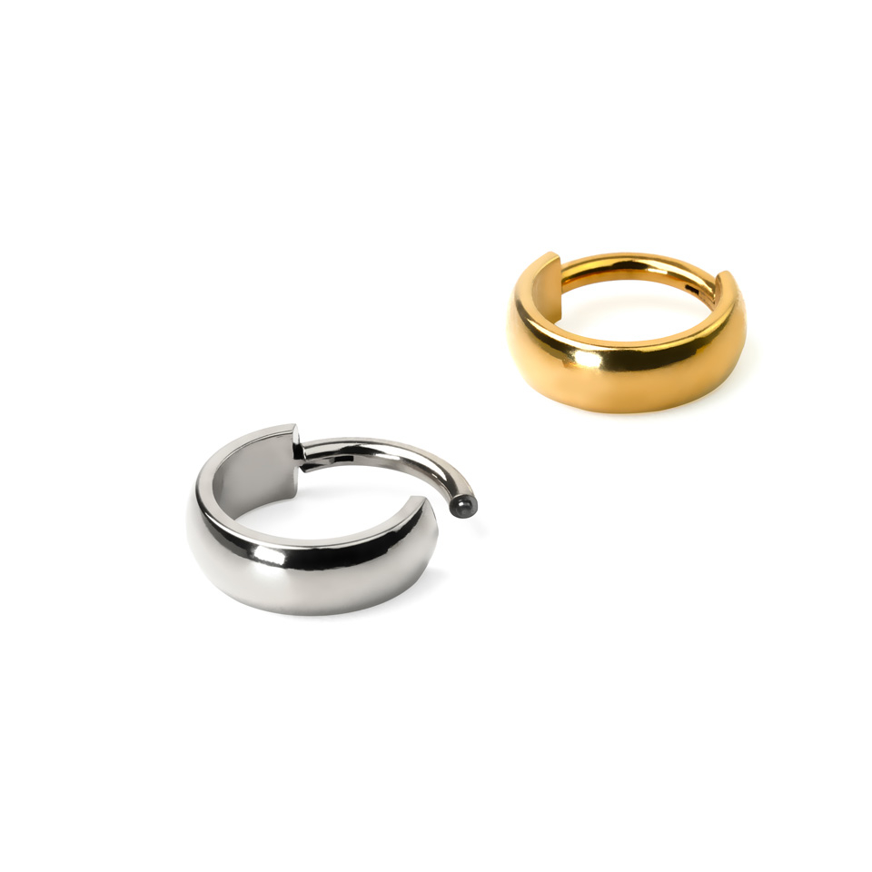 Questo cerchio in titanio con cerniera e grande arco esterno è un gioiello dallo stile unico. É disponibile in 4 colori: grigio brillante, nero, oro rosa e oro giallo. Il cerchio ha un diametro del filo di 1,2 mm e un diametro totale a scelta tra 8 mm e 10 mm.