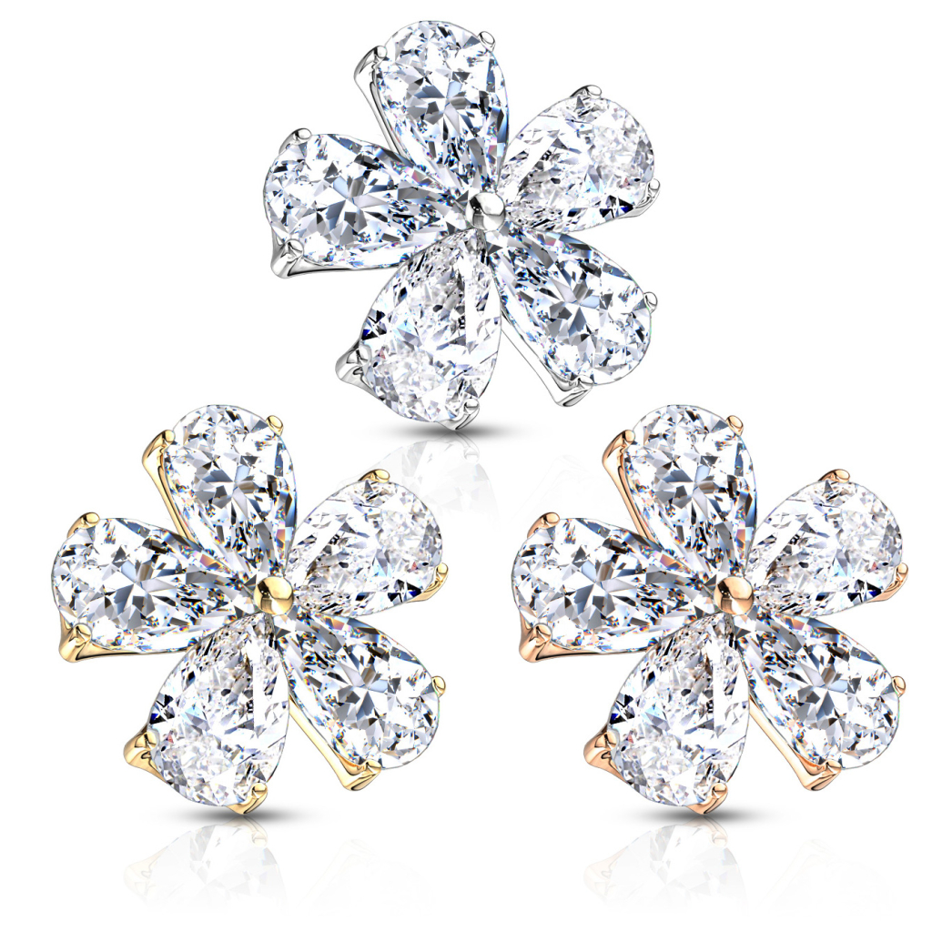 L'accessorio su cui hai cliccato è un dermal che rappresenta un fiore in cui cinque pietre a forma di goccia sono state incastonate a formarne i petali. E' realizzato in ottone successivamente rivestito per donargli un colore magnifico. Puoi scegliere tra una varietà di colori, inclusi, ad esempio, oro bianco e oro rosa.