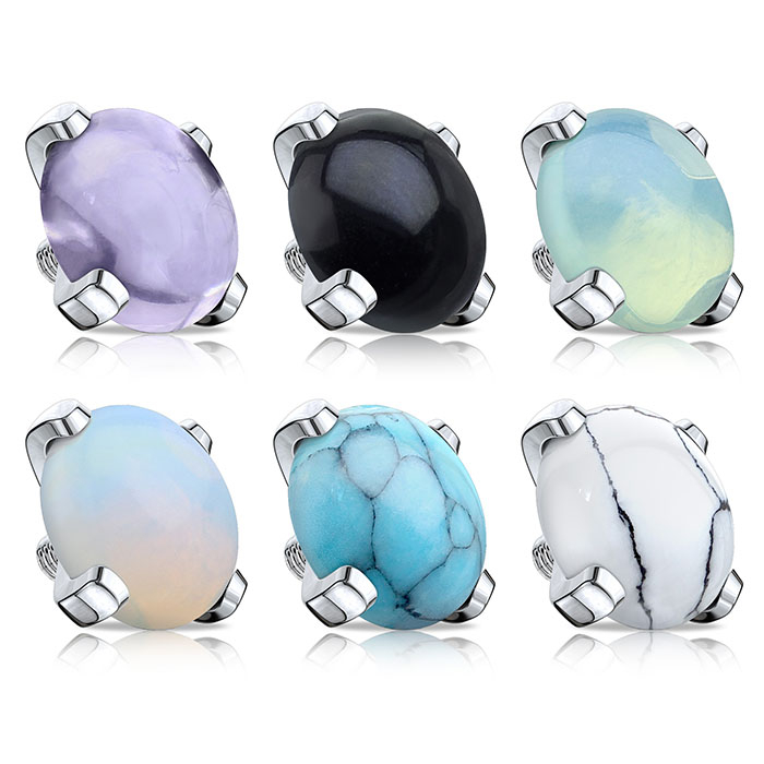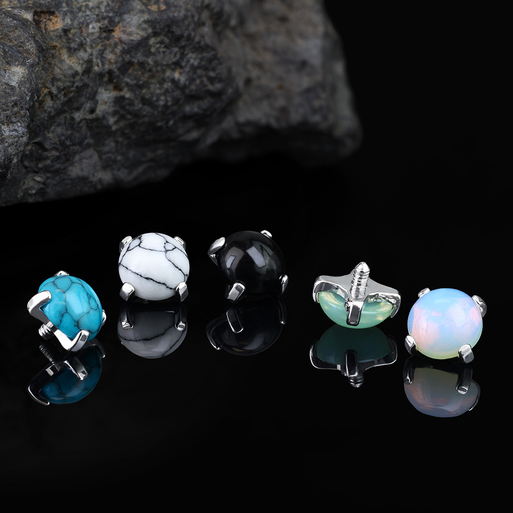 Nella foto sopra puoi vedere un dermal in acciaio chirurgico. Il gioiello nella parte posteriore è stato modellato in modo tale da avere una filettatura mentre nella parte anteriore presenta quattro bracci di presa. Il dermal è quindo piatto sul retro, il che significa che entrerà perfettamente in contatto con la pelle quando lo si avvita nella base dermica. Per quanto riguarda la pietra del gioiello, è possibile scegliere tra diverse tipologie, come per esempio quella realizzata in opalite oppure quella in ametista; ogni tipo di pietra conferisce al gioiello un aspetto nuovo e interessante. La pietra del dermal misura 5 mm, che lo rende abbastanza grande da creare un eye catche con il giusto posizionamento.