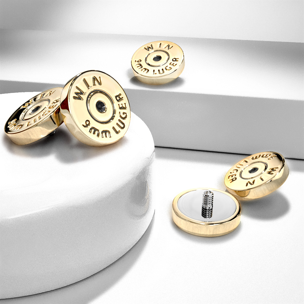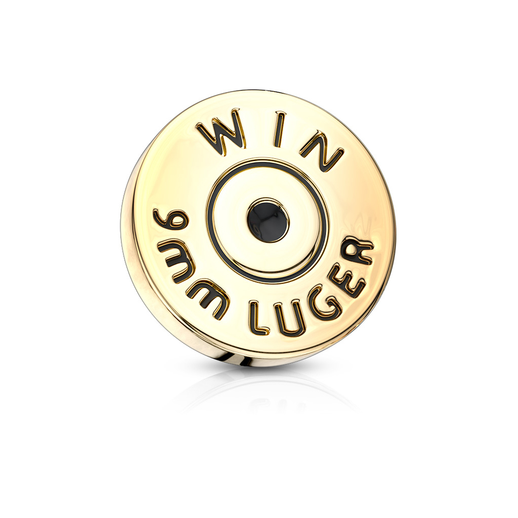 Il gioiello è realizzato in acciaio chirurgico e questa sarà la parte che verrà a contatto con la tua pelle. La pallottola è realizzata in ottone ed è rivestita con color oro, quindi sembra una vera e propria pallottola. Il gioiello misura all'incirca 7 mm, quindi c'è anche molto spazio per il testo inciso, che puoi vedere nella foto più in alto.