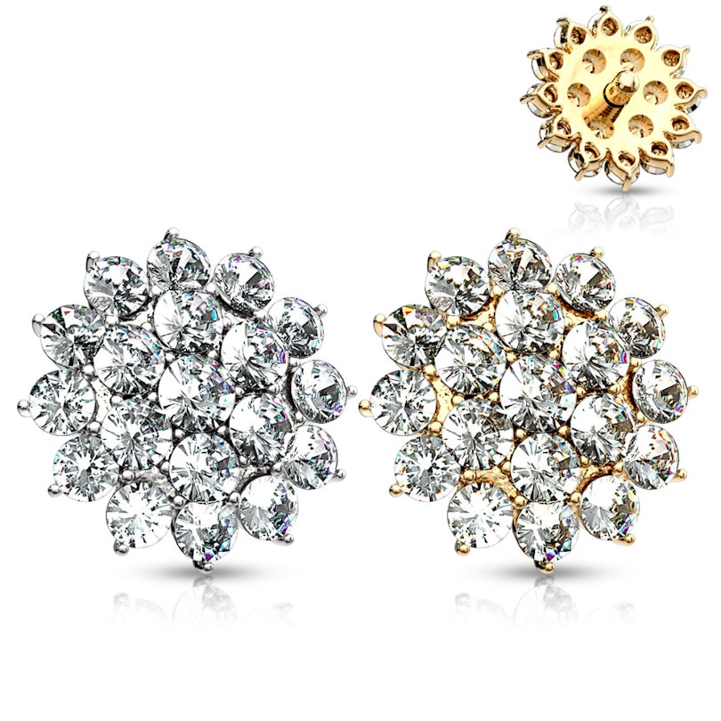 Qui troverai un originale gioiello che decorerà meravigliosamente il tuo microdermal. Il design presenta un fiore ricoperto con tantissime pietre brillanti che lo rendono estremamente lucente. Le pietre sono tenute a posto grazie alla montatura a griffe che mantiene ognuna di esse.