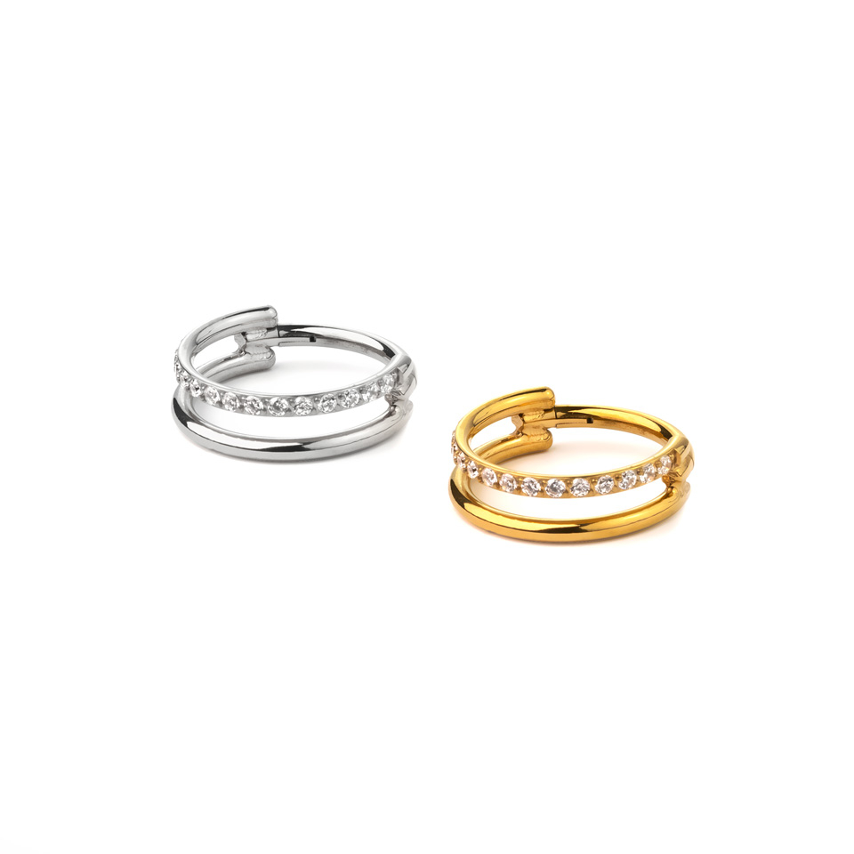 Questo originalissimo gioiello presenta un look con due cerchi, uno semplice e uno con una fila di piccole pietre. I due cerchi sono collegati in una filettatura unica, che passa attraverso il tuo piercing. É realizzato in titanio, quindi è ipoallergenico e duraturo. Disponibile in vari diametri e nei colori oro giallo e grigio brillante, questo bellissimo cerchio è adatto a vari piercing all'orecchio e sarà un'aggiunta piena di stile alle tue combinazioni, ovunque tu decida di indossarlo.