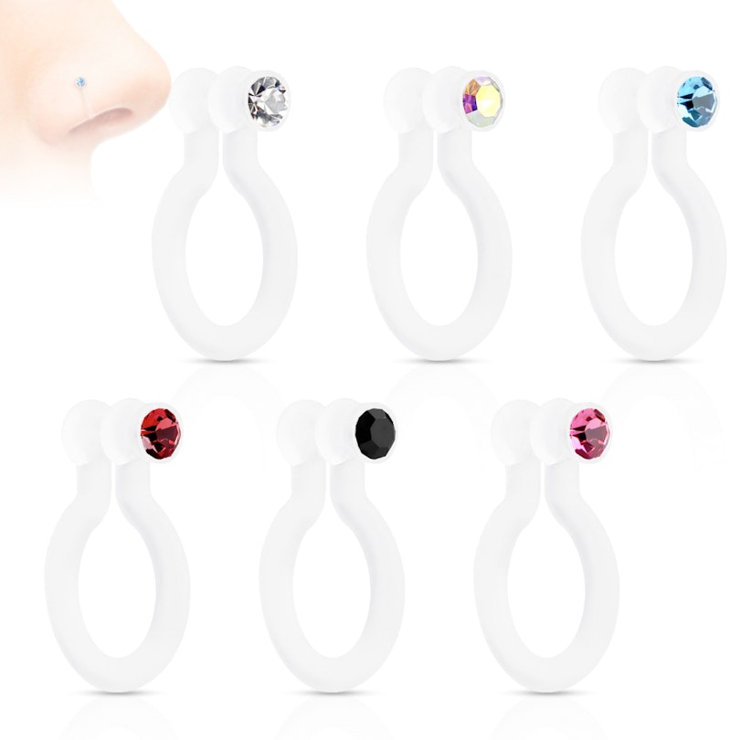 Qui puoi trovare questo bel fake piercing per il naso con una semplice e discreta pietra, senza dover fare il buco. Questo bel gioiello è un piccolo e trasparente anello di PTFE, un materiale plastico quasi invisibile e morbido, con una pietra proprio al posto della quale ci dovrebbe essere il buco. In realtà questo gioiello è solo un gancio che va attorno al naso. La flessibilità e le estremità del materiale che sono a forma di piatto fanno sì che il gioiello rimanga attaccato ai bordi del naso.