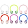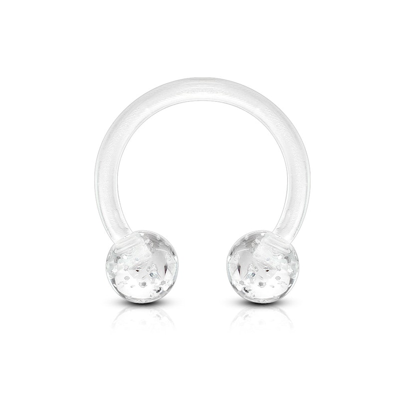 Nell'immagine soprastante puoi scoprire un bellissimo ferro di cavallo fatto in acrilico dotato di sfere da piercing decorate con glitter. Questo ferro di cavallo è disponibile in diversi colori, tra i quali il blu, il verde e il rosa. Il colore sul ferro di cavallo non è al 100% identico a quello delle sfere. Ad esempio, se prendiamo in considerazione il modello blu, il colore del ferro di cavallo è leggermente più chiaro del colore delle sfere. Un vantaggio di questo gioiello è la sua flessibilità, aspetto che ne facilita l'inserimento attraverso il foro del piercing.