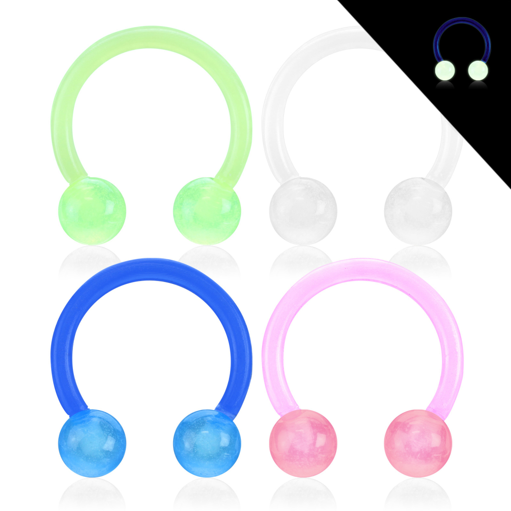 Quando spegni la luce, il ferro di cavallo nell'immagine soprastante s'illumina. È infatti un ferro di cavallo fluorescente, fatto in acrilico. Durante il giorno, questo gioiello ha lo stesso aspetto di un normale ferro di cavallo ma, di notte, s'illumina emanando una bellissima luce. Questa particolarità fa sì che il gioiello sia perfetto per le feste più colorate. Il gioiello può inoltre essere utilizzato in diverse parti del corpo, fintanto che le sue sono adatte a quelle del tuo piercing. Normalmente viene utilizzato per il septum, ma è perfetto anche nei piercing all'orecchio oppure al sopracciglio. La scelta è tua!