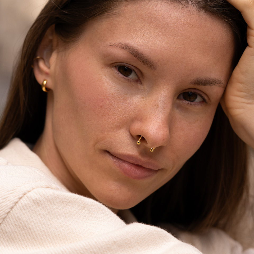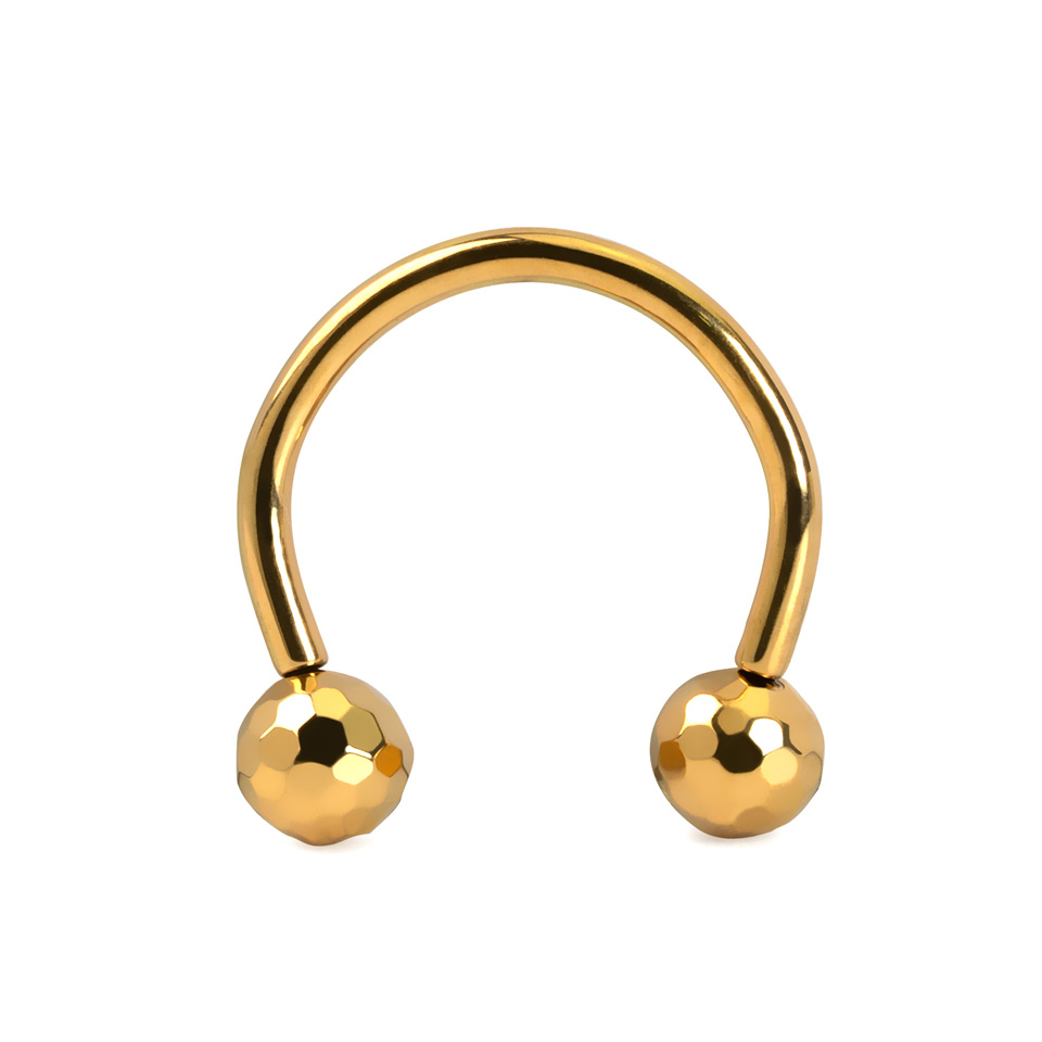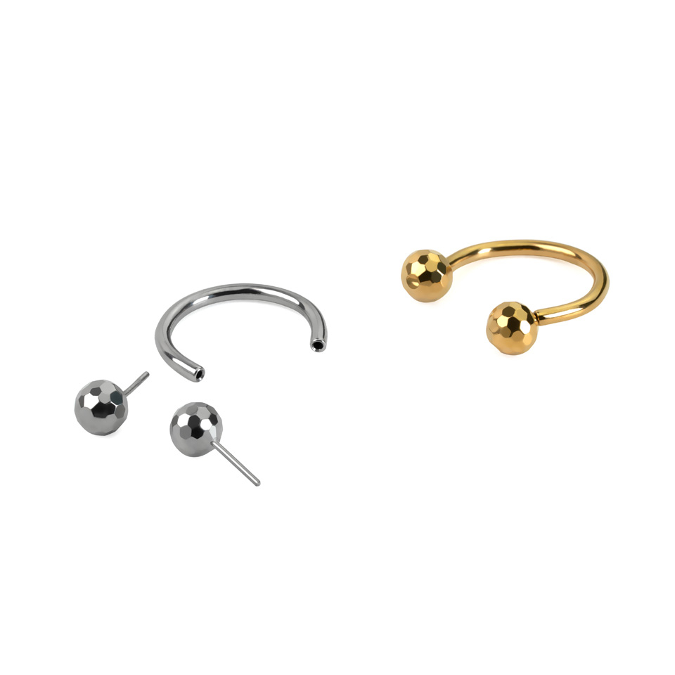 Questo ferro di cavallo in titanio è senza filettatura ma dotato di un meccanismo push-in: le sfere sono dotate di piccoli pin da spingere nel ferro di cavallo per fissarlo al tuo piercing. Le sfere sono multi faccettate, il che significa che hanno un look intrigante che ricorda mini sfere da disco. Questo gioiello è adatto a vari piercing, inclusi quelli al sopracciglio, orecchio e septum. É disponibile nelle finiture color oro giallo o grigio brillante.