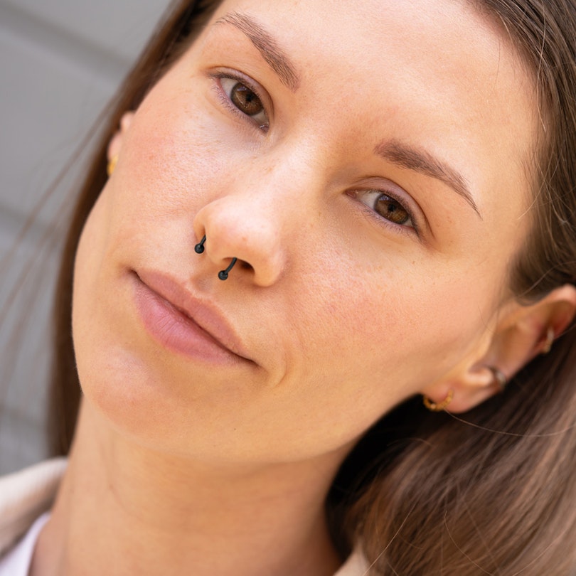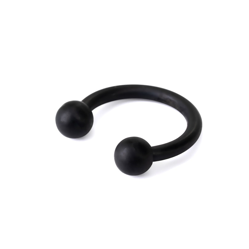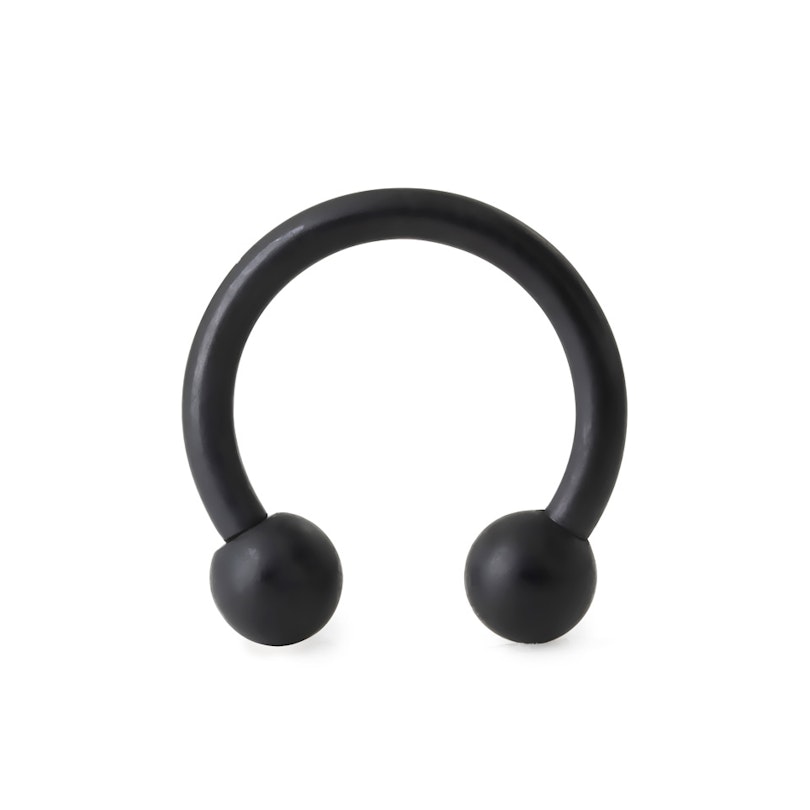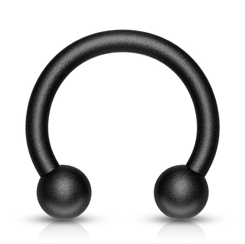 Questo gioiello è come tutti gli altri ferri di cavallo: un cerchio aperto con una sfera a ciascuna delle due estremità. L'unica differenza tra questo ferro di cavallo e gli altri è il colore. Il colore più standard è il brillante metallico, ma questo è rivestito in delizioso nero opaco, che regala un look più discreto allo sguardo.