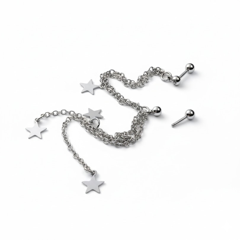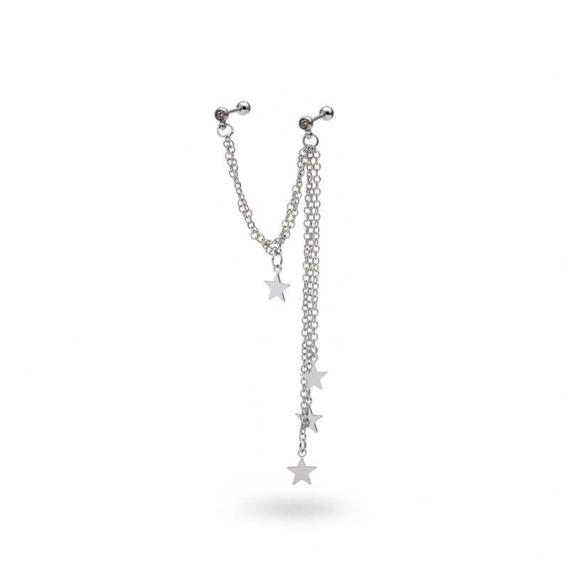 Piercing 2 in 1 per tragus e l'helix. Piercing con doppio perno con una pietra chiara incastonata di 4 mm su ognuna di essa. I due perni sono collegati da due catenine che doneranno un effetto spettacolare alle orecchie.