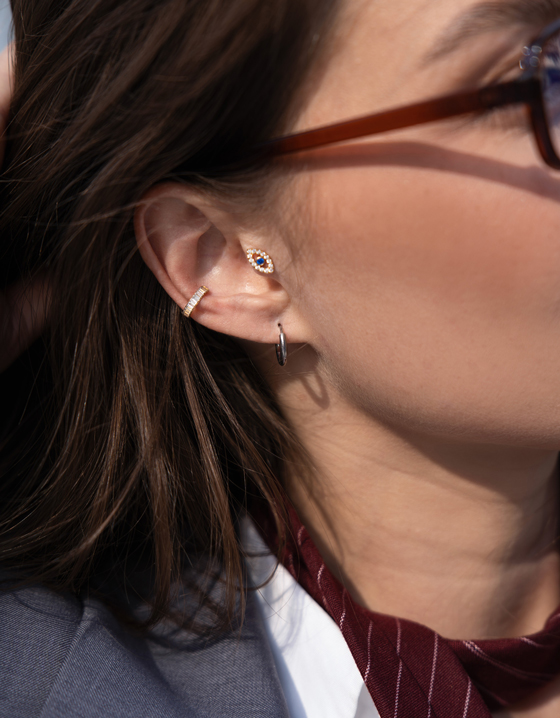 Gli orecchini industrial sono naturalmente rari, ma puoi sempre combinare più di un piercing all'orecchio per creare qualcosa che sia totalmente tuo e solo tuo. Una cosa grandiosa del piercing industrial è che è già un doppio piercing di per sé, e questo rende solo più facile assemblare una tripla composizione. Forse un grazioso piccolo orecchino è il complemento perfetto per il tuo audace industrial, sia nel lobo, trago o persino nell'helix stesso, proprio accanto alla tua barra. Mettere insieme più elementi che attirano l'attenzione ti consente di liberare davvero la tua creatività, e l'industrial è un tipo di piercing dai tratti così distintivi che funziona bene con qualsiasi cosa. Divertiti a provare composizioni ed esprimi chi sei in mille modi.