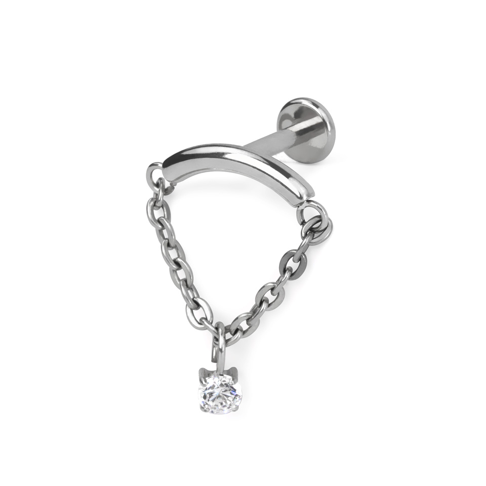 Questo elegante labret in titanio presenta una barra curva con catenella a cerchietti che collega le due estremità. Da uno di questi cerchietti pende una brillante pietra incastonata. Dato che la pietra non è fissata al centro della catenella, penderà sempre dal punto più basso, dando così al gioiello un effetto diverso a seconda di come è orientato nel tuo orecchio. Sarà favoloso, ad esempio, nei piercing al lobo o helix, da solo o come parte di una combinazione di gioielli.