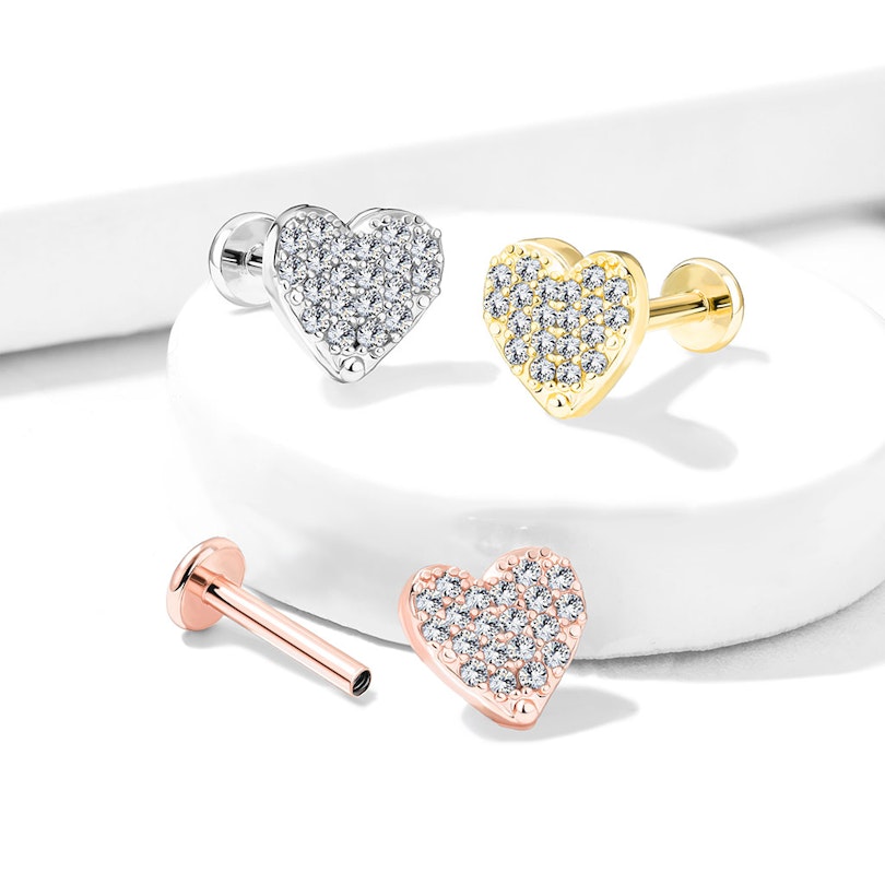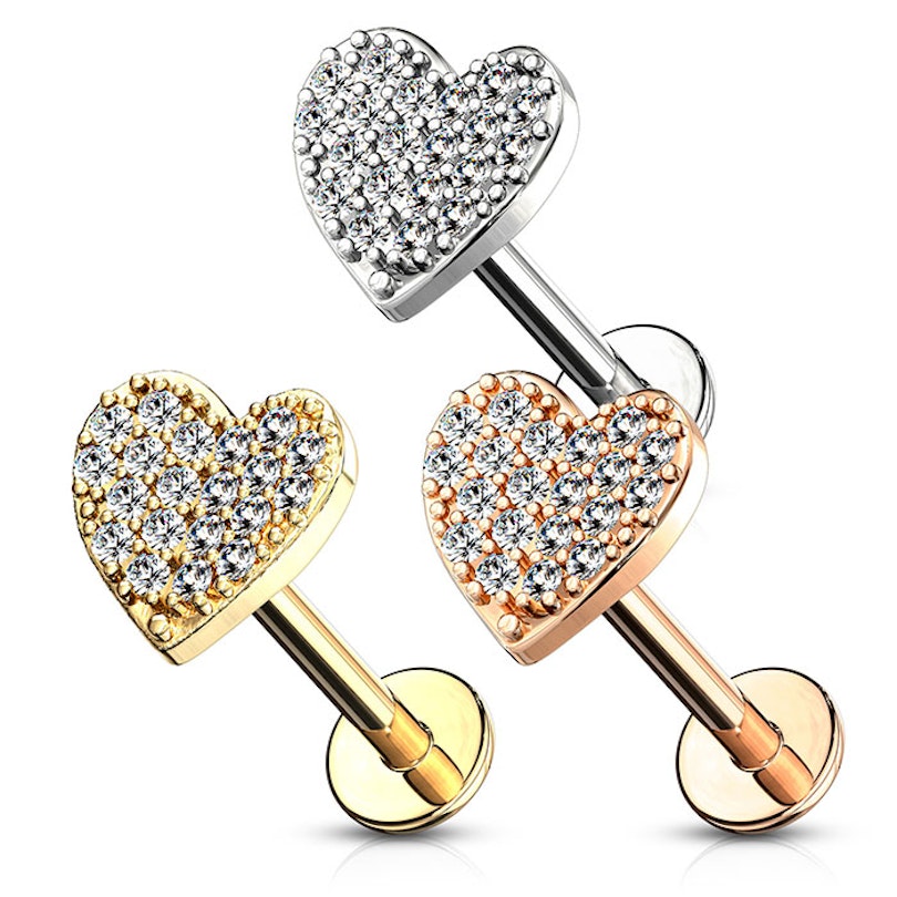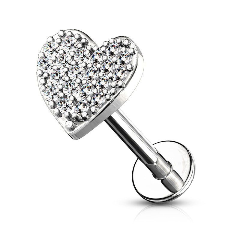 I gioielli da piercing con cuori sono estremamente popolari. Anche il dolce labret che ti presentiamo qui ha un cuore, ma con una marcia in più: il cuore infatti è tempestato da tante piccole pietre trasparenti che lo fanno splendere.