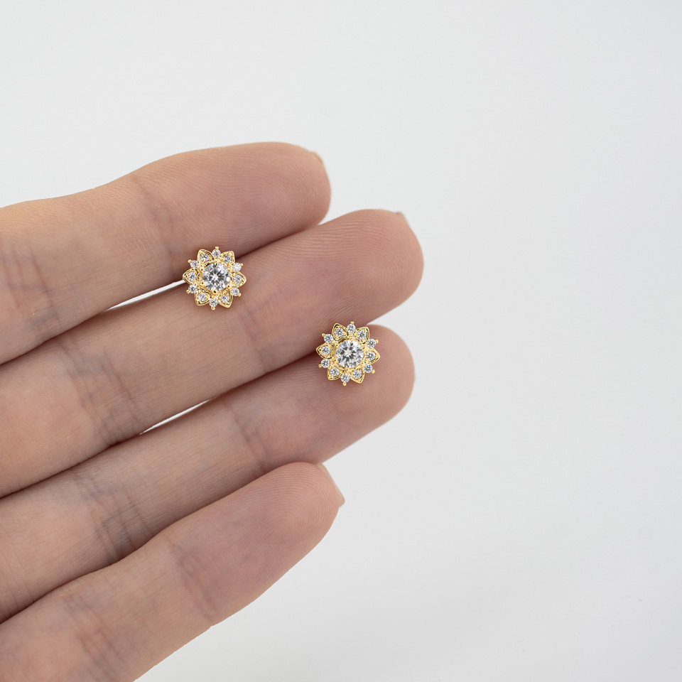 Il design sulla parte superiore consiste in uno splendido fiore di loto realizzato in ottone. L'intero gioiello è rivestito in diversi colori tra cui scegliere: oro, oro rosa e grigio brillante. Il fiore di loto misura 8 mm in totale, è tempestato da tante brillanti pietre trasparenti lungo i bordi e una pietra sfaccettata al centro. La gemma misura 3,5 mm.