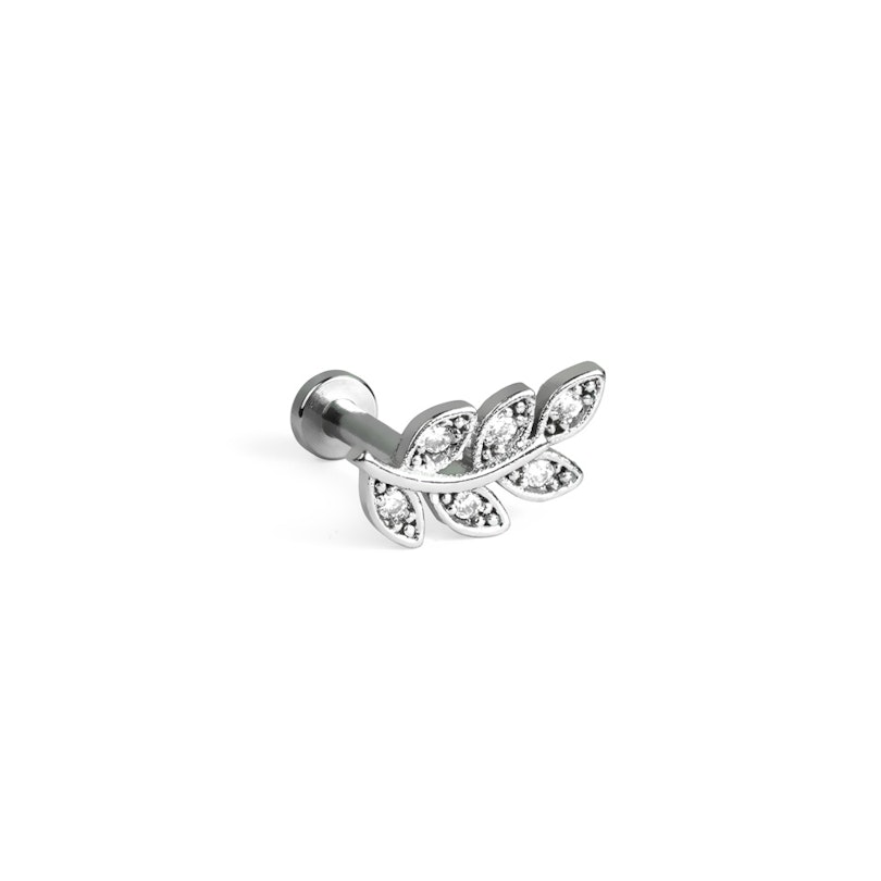 La foglia, con il suo design curvo e le pietre brillanti di zirconia cubica, ha una forma ideale per i piercing all'orecchio. Misura 4,8 mm x 9,5 mm, mentre il diametro del filo è di 1,2 mm ed è disponibile in due lunghezze, 6 mm o 8 mm. Puoi usare questo gioiello nel tuo piercing helix, tragus, conch o al lobo, ad esempio.