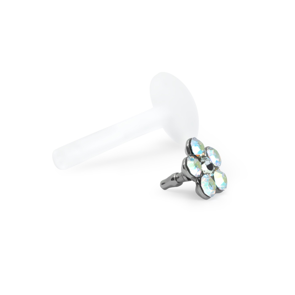 Questo che vedi è un carinissimo labret in PTFE con un fiore nella parte superiore formato da gemme colorate. É un gioiello versatile che puoi usare in numerosi piercing, perfetto per un look fuori dal comune dato che la maggior parte dei labret hanno una sfera o punta nella parte superiore. Un gioiello, insomma, che fa colpo di sicuro.