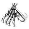I labret sono caratterizzati da una barra dritta fissata a una piastra alla base. É il caso di questo gioiello, con la differenza che non presenta una normale sfera: la sfera superiore è sostituita da una mano di scheletro.