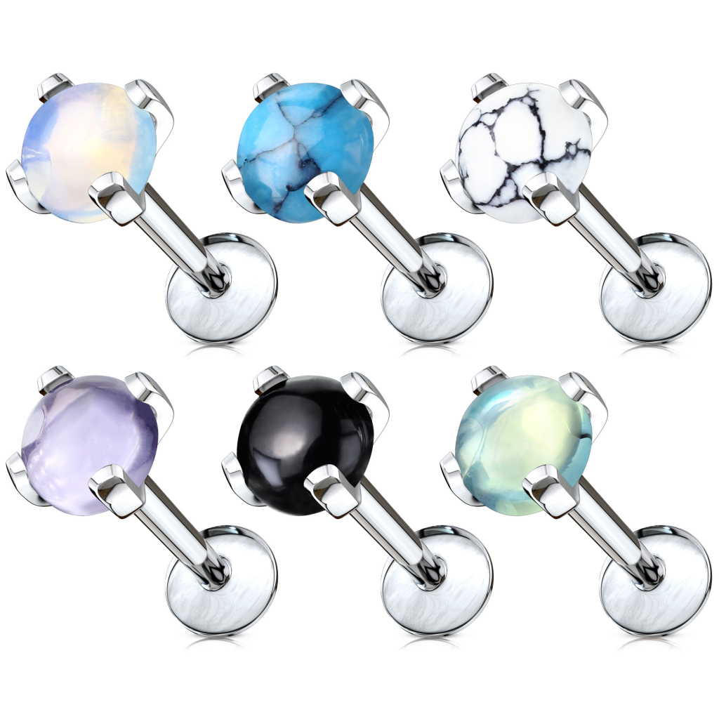 Questo labret presenta una pietra che può essere scelta in due versioni: giada verde o howlite bianca. Ha una lunghezza di 6 mm, quindi è ideale per i piercing al labbro e molti piercing all'orecchio.