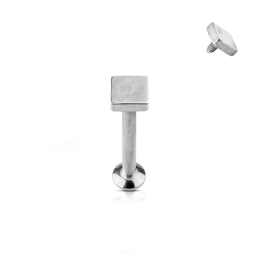 Questo gioiello è un labret ed è un pezzo molto versatile in quanto può essere utilizzato per diversi tipi di piercing. Primariamente si utilizza per piercing al labbro nei quali si inserisce dall'interno verso l'esterno per poi avvitare la piccola punta quadrata che misura 3x3 mm. In questo modo il piccolo piatto, anche questo da 3 mm. in diametro, siede nella parte interna del labbro e la punta quadrata si trova all'esterno.