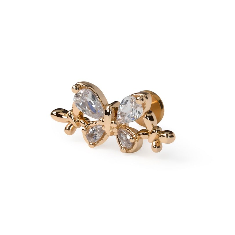Questo labret con tre farfalle è tutto un gioco di dettagli. Al centro si trova una farfalla più grande, formata da pietre trasparenti incastonate a griffe, mentre due farfalle più piccole con finitura dorata si posano ai lati, creando un delicato e raffinato trio.