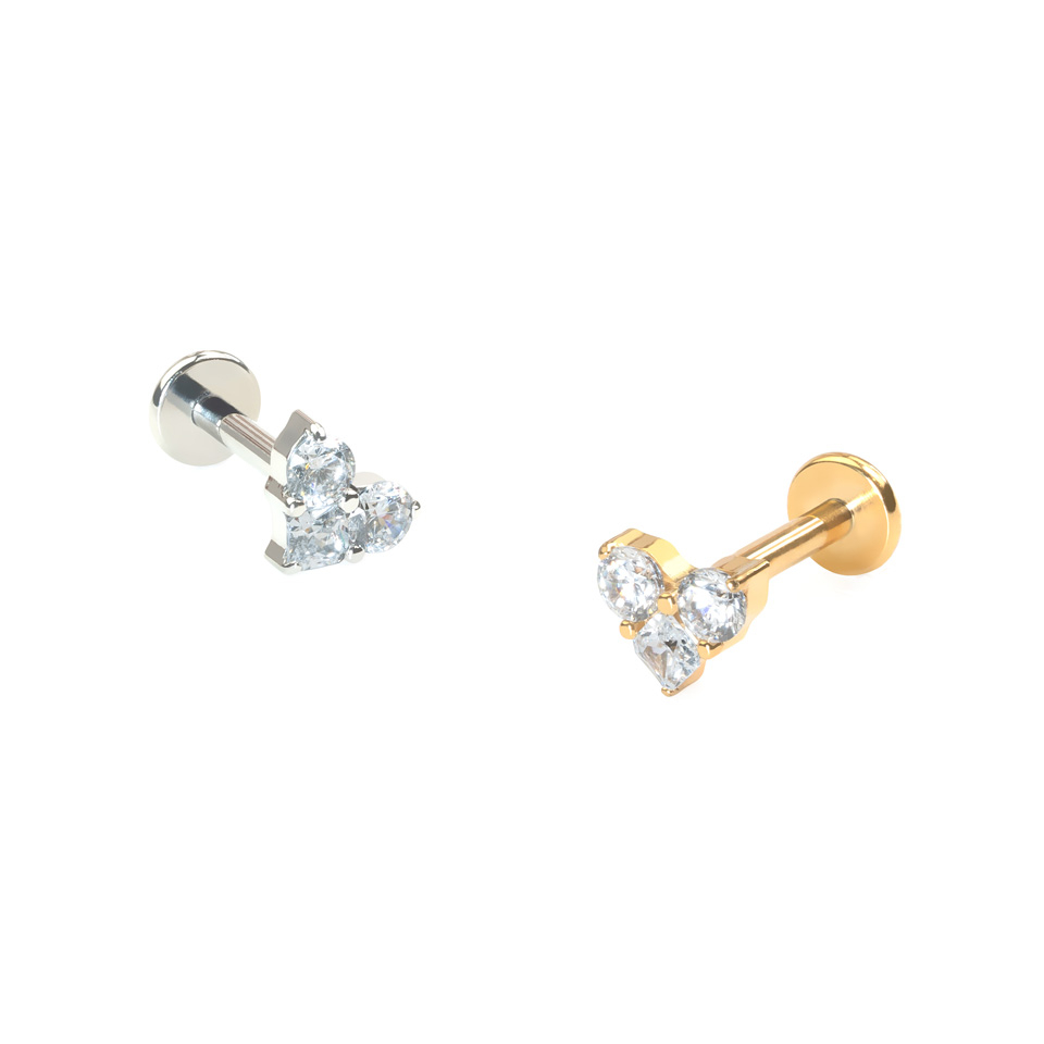 Questo labret in titanio presenta 3 zirconi cubici disposti a forma di cuore. Le due pietre superiori sono rotonde, mentre quella inferiore è quadrata. È dotato di filettatura interna ed è disponibile nelle finiture oro giallo o grigio argento. Questo grazioso gioiello starà benissimo in una vasta gamma di piercing all'orecchio. Misura 5 mm nel suo punto più largo e la parte posteriore piatta assicura una vestibilità comodissima.