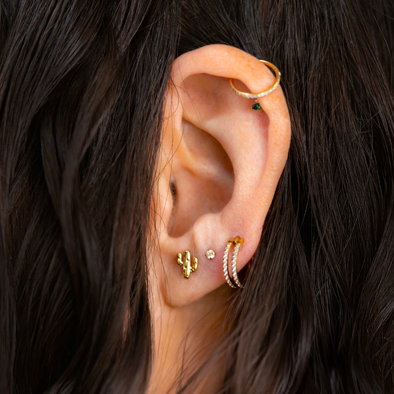 Disponibile nei colori oro giallo o grigio argento, si adatta perfettamente al conch, helix, lobo o tragus. Indossarlo tutti i giorni? Certamente. Dare un glow-up al tuo piercing? Assolutamente.