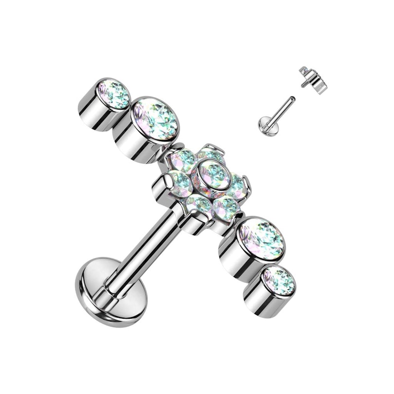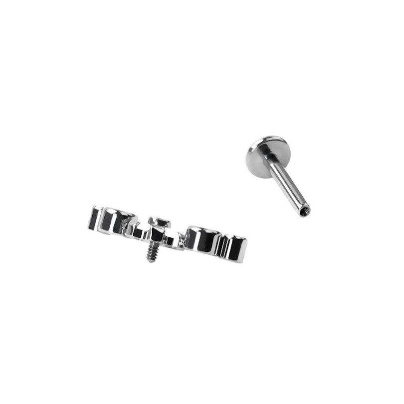Questo labret è realizzato in titanio, uno dei materiali più resistenti e altamente raccomandati per i piercing. É filettato internamente, quindi l'asta ha una filettatura interna. Il top è dotato di un'asta filettata avvitata nel perno, il che evita di graffiare la pelle quando il piercing viene inserito.