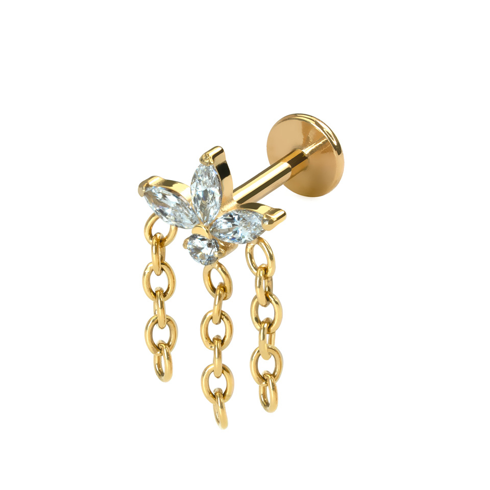 Questo originale labret presenta quattro pietre di zirconia cubica: tre hanno un taglio marquise, e sono disposte uniformemente attorno a una pietra rotonda più piccola, donando così al gioiello la forma di fiore. Ognuna delle tre pietre inferiori ha una deliziosa catena pendente.