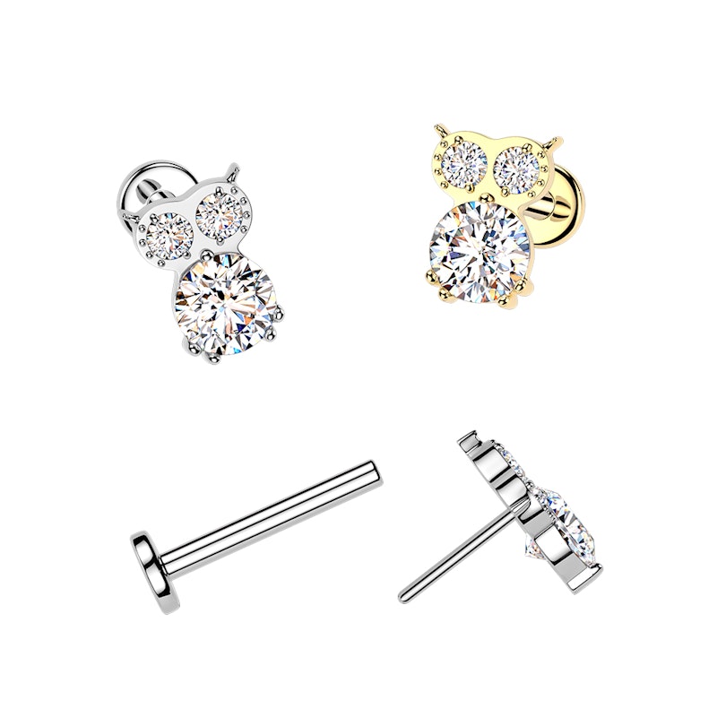 Questo labret in titanio con gufo di pietre aggiunge un tocco di carattere al tuo ear stack. La forma del gufo è arricchita da più pietre montate a griffe, che conferiscono texture al design senza appesantirlo. Disponibile in oro e in grigio argento, è perfetto quando desideri un gioiello sagomato ed espressivo invece che minimalista.
