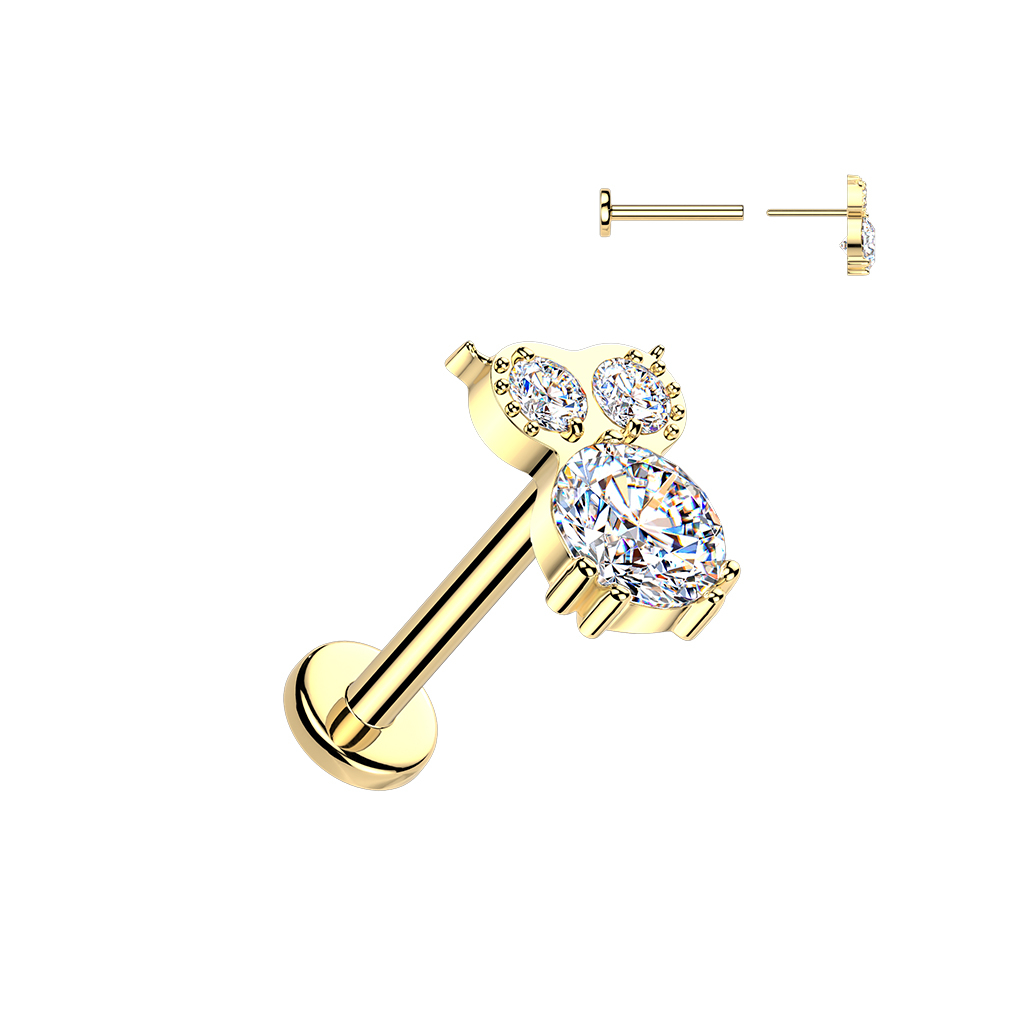 Questo labret in titanio con gufo di pietre aggiunge un tocco di carattere al tuo ear stack. La forma del gufo è arricchita da più pietre montate a griffe, che conferiscono texture al design senza appesantirlo. Disponibile in oro e in grigio argento, è perfetto quando desideri un gioiello sagomato ed espressivo invece che minimalista.