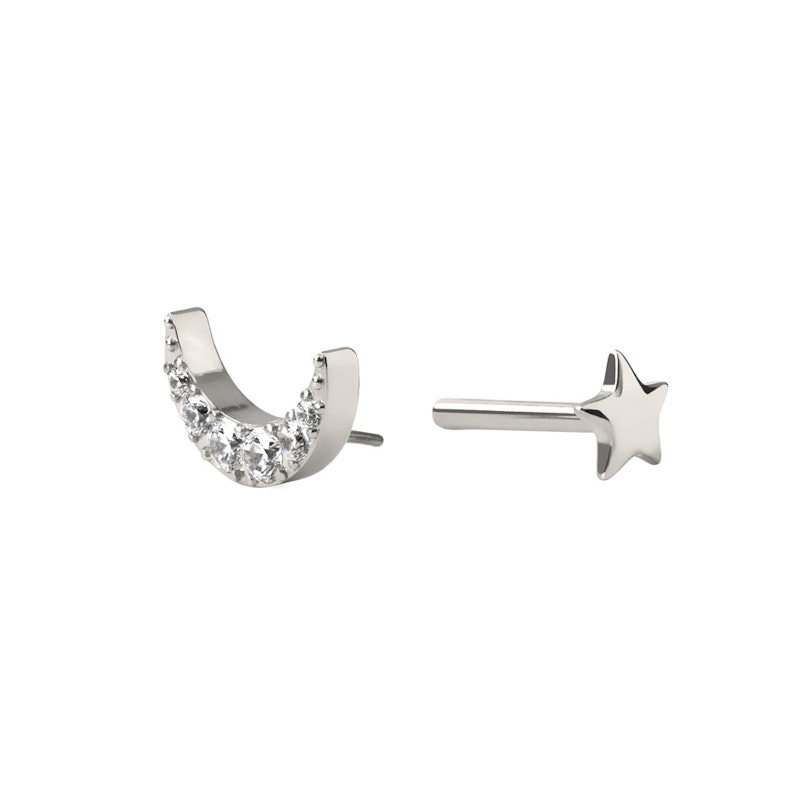 Questo bellissimo labret in titanio presenta una luna tempestata di pietre. Con il suo disco piatto a forma di stella, è un gioiello perfetto per i piercing in cui entrambi i lati sono visibili.