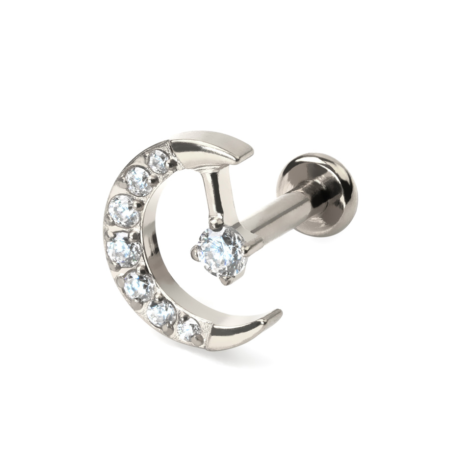 Questo grazioso labret presenta una mezzaluna tempestata di piccole pietre di zirconia e una pietra di zirconia più grande attaccata alla parte superiore della luna.