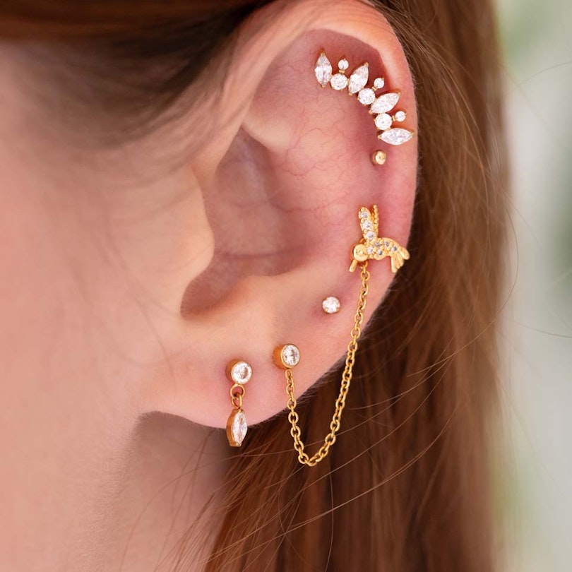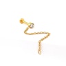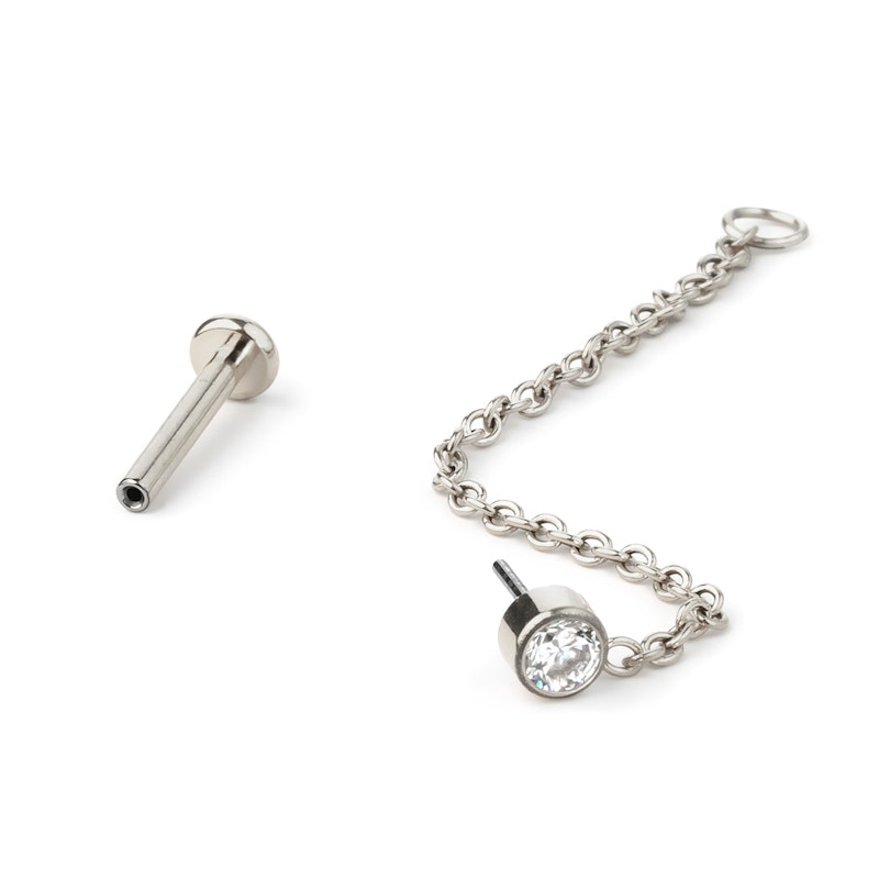 Questo semplice labret presenta una pietra incastonata e una catenella attaccata nella parte inferiore della pietra tramite un piccolo cerchio. La catenella ha un cerchio più grande all'altra estremità, quindi puoi sia attaccarla sul retro del labret in modo che avvolga l'orecchio oppure collegarla a un altro gioiello.
