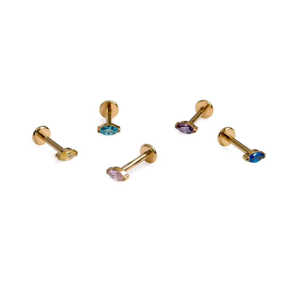 La pietra taglio marquise dona un look raffinato in qualsiasi modo tu lo voglia indossare. Realizzato in titanio ASTM F136, questo gioiello è ipoallergenico, waterproof e con la giusta cura può durare una vita. La filettatura interna evita le irritazioni e lo mantiene in posizione, quindi non ti dovrai preoccupare di perderlo.