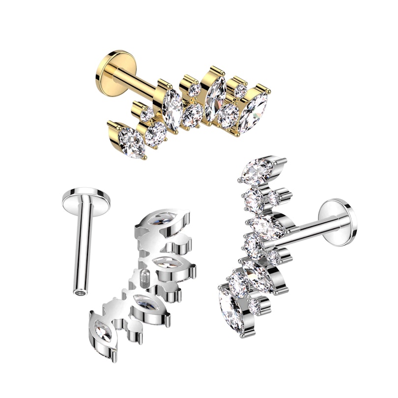 Questo bellissimo labret in titanio alterna pietre trasparenti rotonde a pietre dal taglio marquise. La forma curva di questo gioiello è particolarmente adatta ai piercing al lobo e helix, dove segue la forma dell'orecchio.