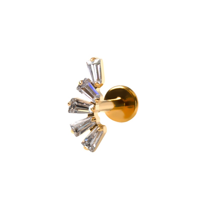 Questo labret in titanio con pietre taglio baguette è pensato per i momenti che richiedono struttura. Le pietre tagliate a baguette si allineano in modo preciso, creando un effetto ordinato sull’orecchio per un look equilibrato e raffinato.