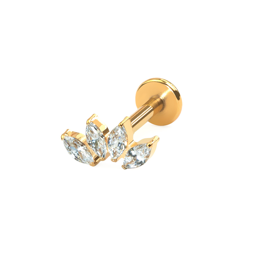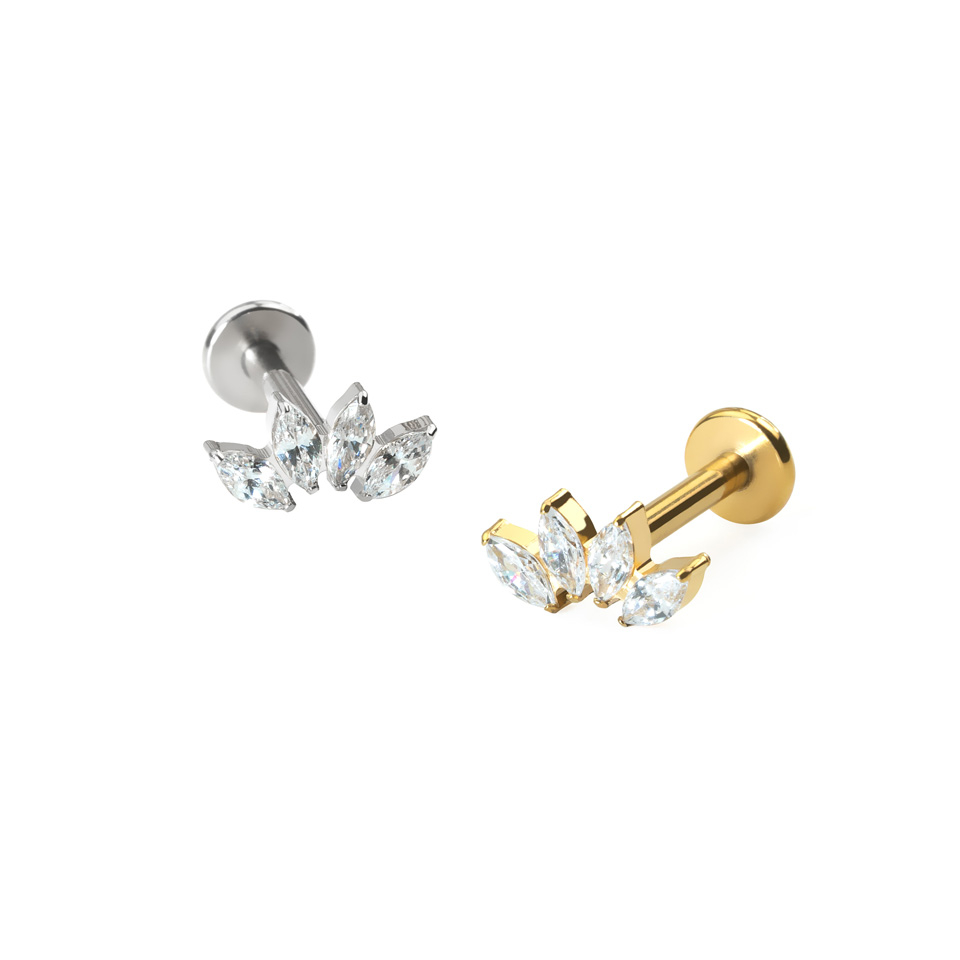 Questo delicato labret presenta 4 pietre di zirconia cubica a taglio marquise disposte a curva. Ideale per una vasta gamma di piercing all'orecchio, è particolarmente adatto ai piercing conch o flat. Il gioiello è dotato di filettatura interna, quindi per indossarlo basta far passare l'asta liscia attraverso il piercing e poi avvitare il top per fissarlo. È realizzato in titanio, quindi è comodo da indossare anche per chi ha la pelle sensibile.