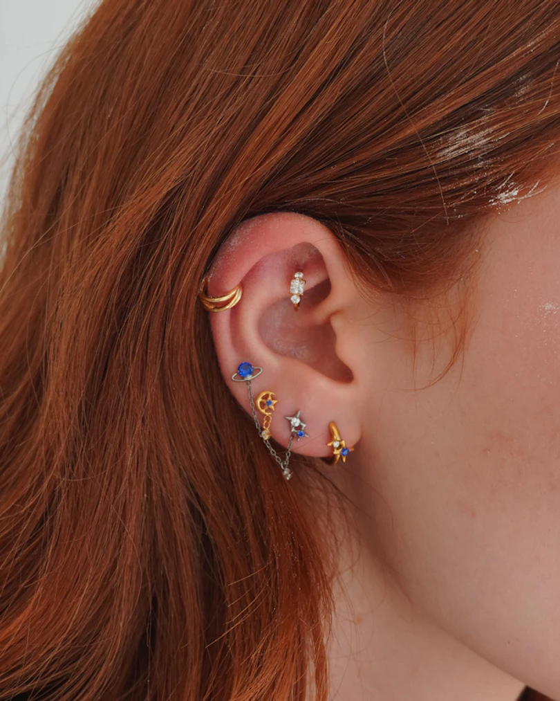 Questo duo spaziale di labret in titanio esplora il tema della connessione e del movimento. Uno ha la sagoma di un piccolo pianeta, l'altro è impreziosito da minuscole stelline, e sono collegati da una sottile catena con una piccola pietra sospesa al centro. Zirconi trasparenti e blu creano un delicato contrasto, donando al gioiello un look armonioso e dal fascino spaziale, ma mai eccessivo. Con finitura color argento, è pensato per essere indossato in coppia.