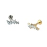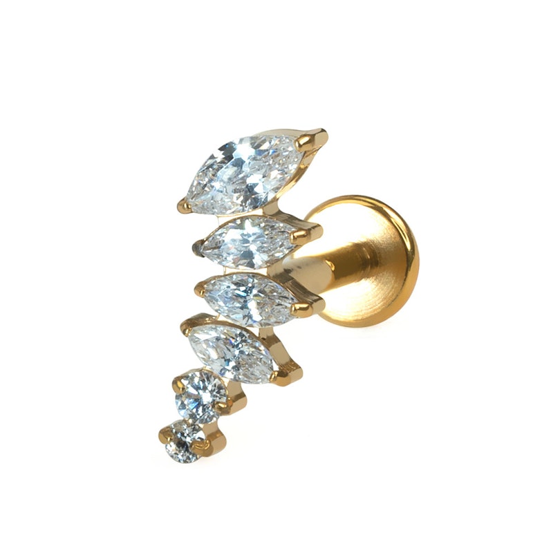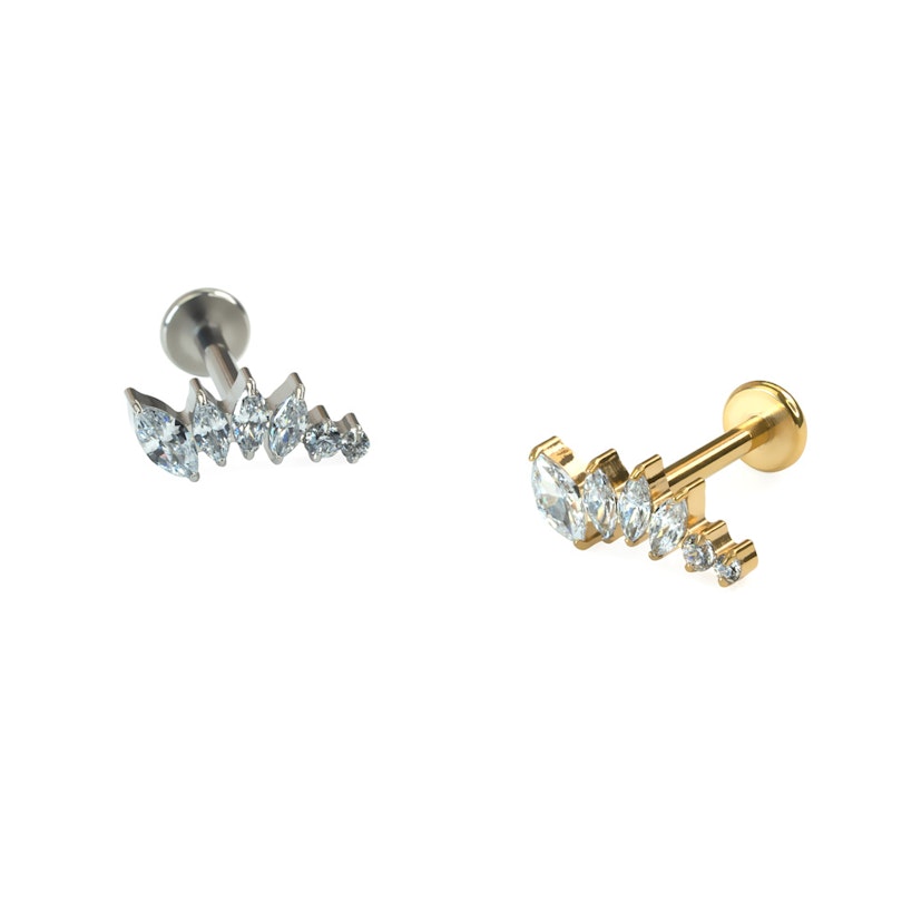 Questo labret presenta pietre di zirconia cubica a taglio marquise in misure decrescenti disposte in una delicata forma a curva, perfetto per essere indossato in piercing come helix, flat, o lobo superiore, dove la forma curva segue il contorno dell'orecchio. Il gioiello è dotato di filettatura interna, quindi per indossarlo basta far passare la barra attraverso il piercing e poi avvitare il top per fissarlo. Realizzato in titanio, è adatto anche alla pelli più sensibili.