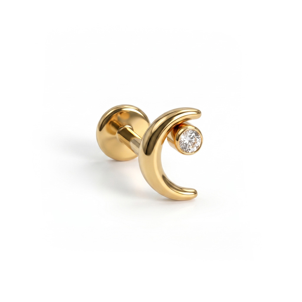 Il labret in titanio luna con stella fonde i due elementi in un unico design raffinato. La luna si appoggia delicatamente sulla pelle, mentre una piccola pietra incastonata, simbolo di una stella, aggiunge un tocco compatto e luminoso. Facile da abbinare a diversi setup, mantiene comunque un carattere deciso. Disponibile nelle varianti color oro e grigio argento.