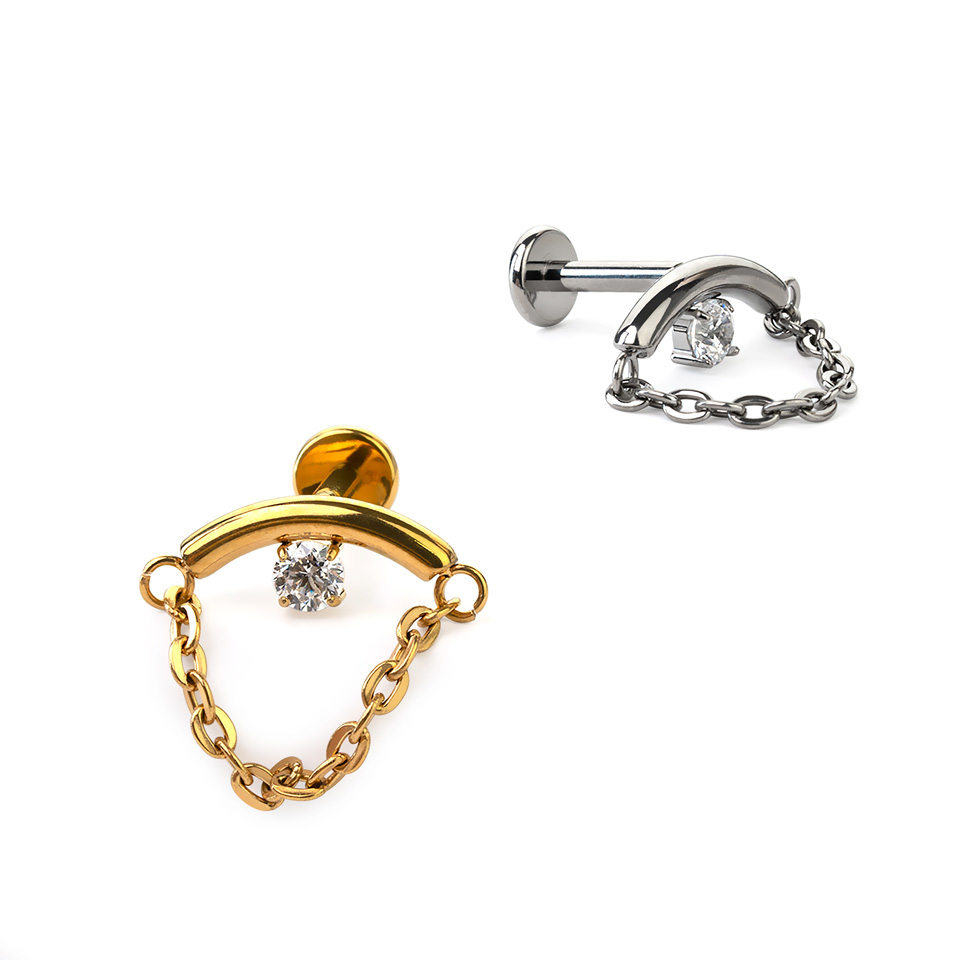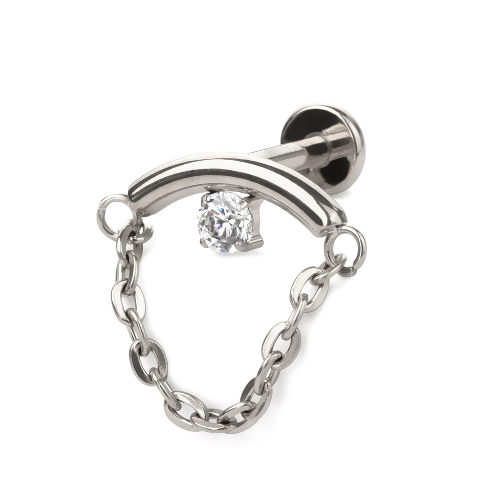 Questo labret in titanio presenta una barra curva con catenella a cerchietti che unisce le due estremità. Al centro della barra c'è una pietra incastonata. Puoi indossare questo labret in modo orizzontale nel tuo lobo oppure nel tuo helix, dove la curva seguirà il contorno del tuo orecchio.