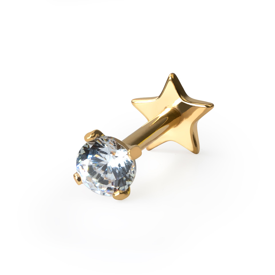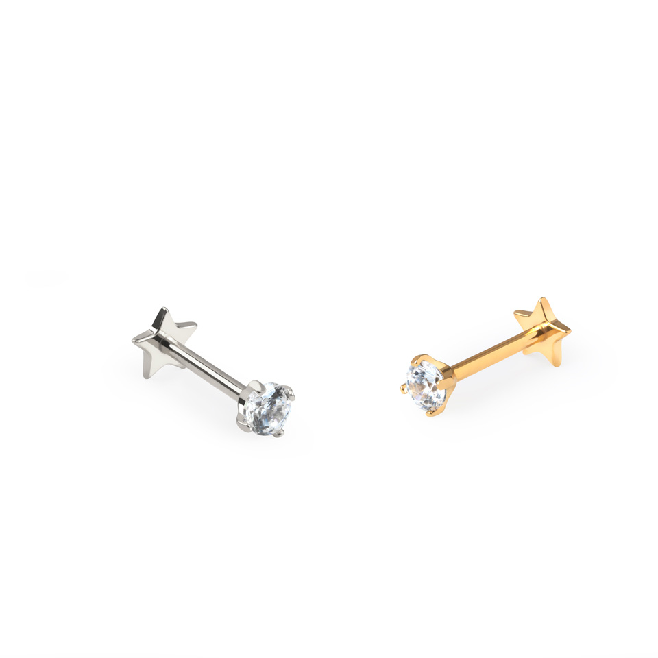 Questo labret in titanio presenta una stella nella parte del disco piatto, perfetto per i piercing come quelli al lobo o helix, dove la parte posteriore del gioiello è visibile.