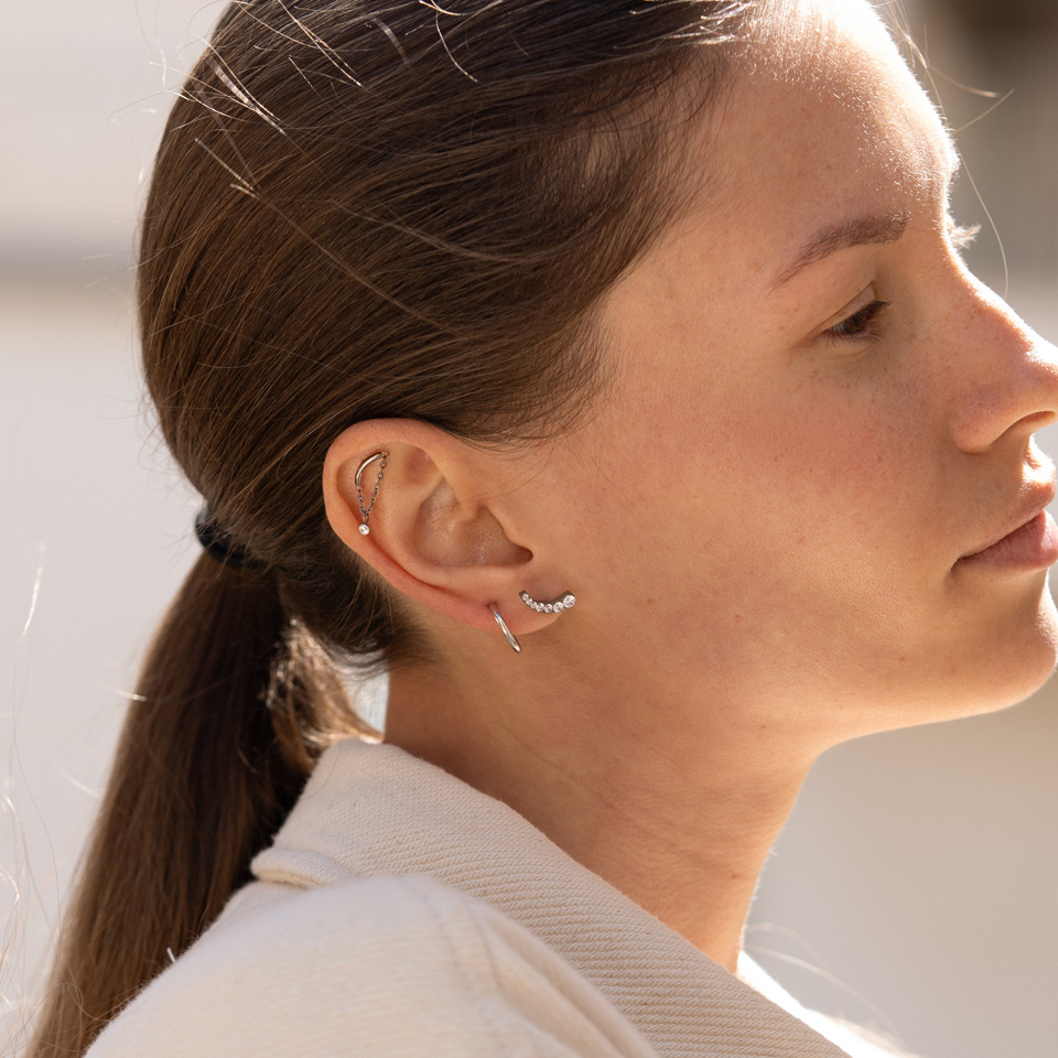 Il labret ha un pratico meccanismo di chiusura push-in, quindi cambiare il gioiello è super facile! Puoi usare i labret in diversi piercing, come nella maggior parte dei piercing all'orecchio e piercing al labbro. Il design curvo di questo modello è specialmente idoneo ai piercing al lobo e helix, dove segue la forma dell'orecchio.