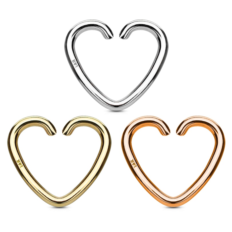 Puoi comprare questo cuore in diverse versioni: puoi scegliere il tipo di oro e il diametro del filo adatto al tuo piercing. Le misure interne di questo cuore sono 10 mm di larghezza per 9 mm di altezza. Tutti i modelli hanno la stessa misura, ma diversi diametri del filo. Puoi indossarlo nella maggior parte dei piercing all'orecchio, ma probabilmente si adatta maggiormente al piercing al trago, helix e daith.