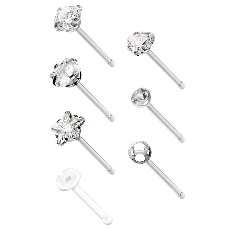 Con questo pacco di barre da naso hai tutta la libertà necessaria per personalizzare il tuo aspetto. Inoltre, sono tutte fatte in acciaio chirurgico, eccezione fatta per il retainer. Le dimensioni sono le stesse per tutti i modelli: diametro del filo da 0,8 mm e una lunghezza pari a 6 mm.