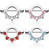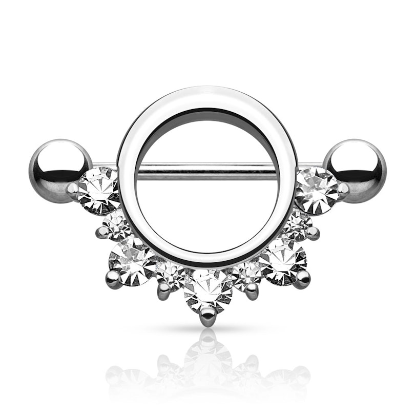 La parte inferiore presenta pietre rotonde, disponibili in vari colori. L'arco ha cinque pietre grandi e altre cinque più piccole, disposte secondo dimensioni alternate. Le pietre più piccole sono tutte bianche, mentre quelle più grandi sono disponibili in vari colori. Puoi scegliere il modello classico, in cui tutte le pietre sono bianche. Se però vuoi donare al tuo capezzolo un tocco vivace, puoi combinare le pietre bianche con altre di colore rosso, rosa o turchese.