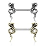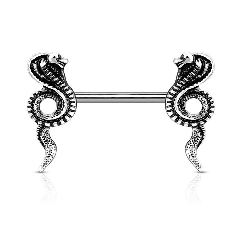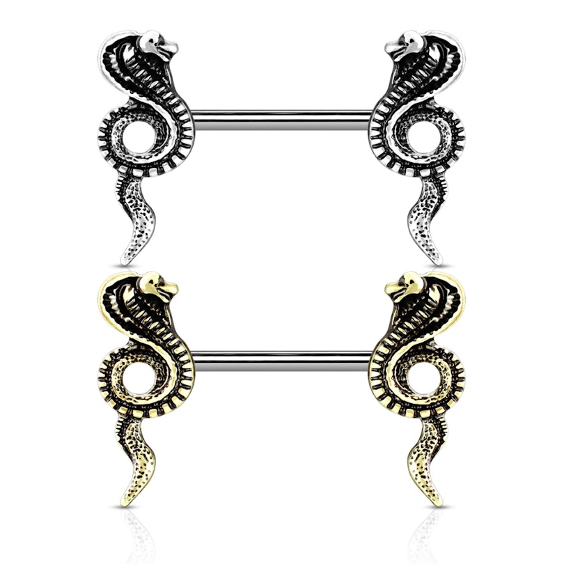 Questo gioiello consiste in un asta lunga all'incirca 14 mm e spessa 1,6 mm. Ad ogni estremità c'è un cobra contorto. I due serpenti sono simmetrici, in modo che siano uno di fronte all'altro. I tubi misurano poco meno di 20 mm in altezza.