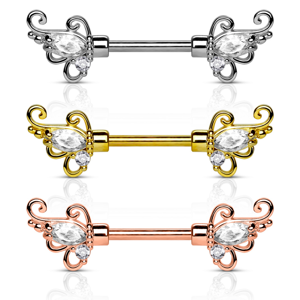 La barra è fatta in acciaio chirurgico e le due estremità sono fatte in ottone. I due modelli dorati hanno anche ricevuto una placcatura che conferisce a loro il calore e la tipica brillantezza dell'oro. Le estremità di questo modello si possono ovviamente svitare, permettendo l'inserimento del gioiello nel corpo.