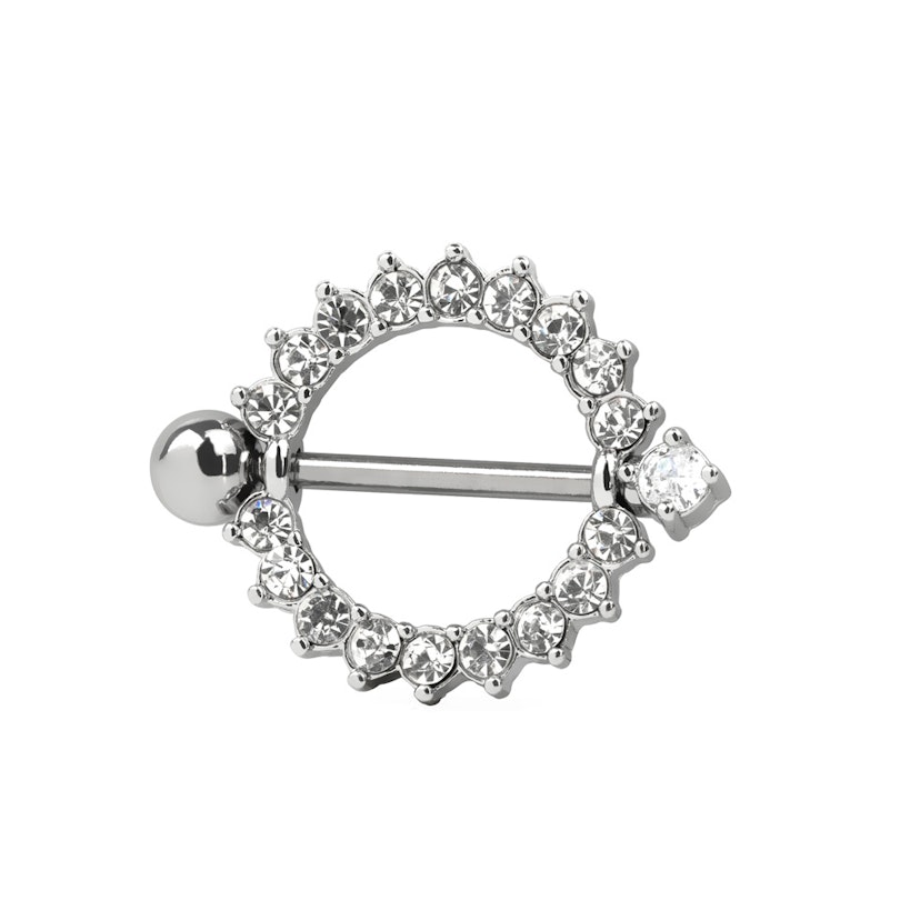 Piercing al capezzolo con un elegante scudo tondo con un giro di pietre trasparenti incastonate lungo tutto il diametro. Una volta indossato ti sentirai come Cleopatra.