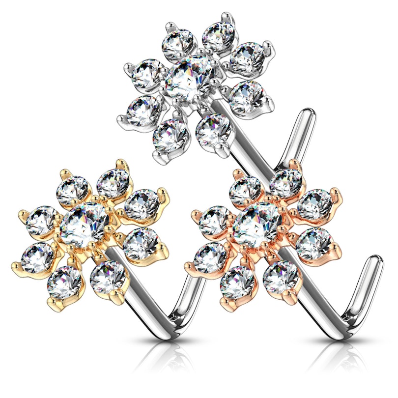 Passiamo ora alla parte più seria. L'asta dei gioiello è realizzata in acciaio chirurgico e presenta una curva di 90 gradi, il che significa che il gioiello si adatta perfettamente al tuo naso. Sarebbe un problema se il gioiello cadesse ogni volta che si muovesse la testa. La stella che si trova nella parte anteriore del gioiello è fatto in ottone e poi rivestito nei diversi colori che è possibile guardare in alto nella foto. I due modelli d'oro nella parte inferiore dell'immagine sono stati rivestiti con oro 14 carati e oro rosso 14 carati. Il modello classico, in colore argento, è stato rivestito con rodio. Sulla stella ci sono anche alcune pietre chiare- una su ogni "braccio" della stella, e una pietra sfaccettata leggermente più grande al centro.